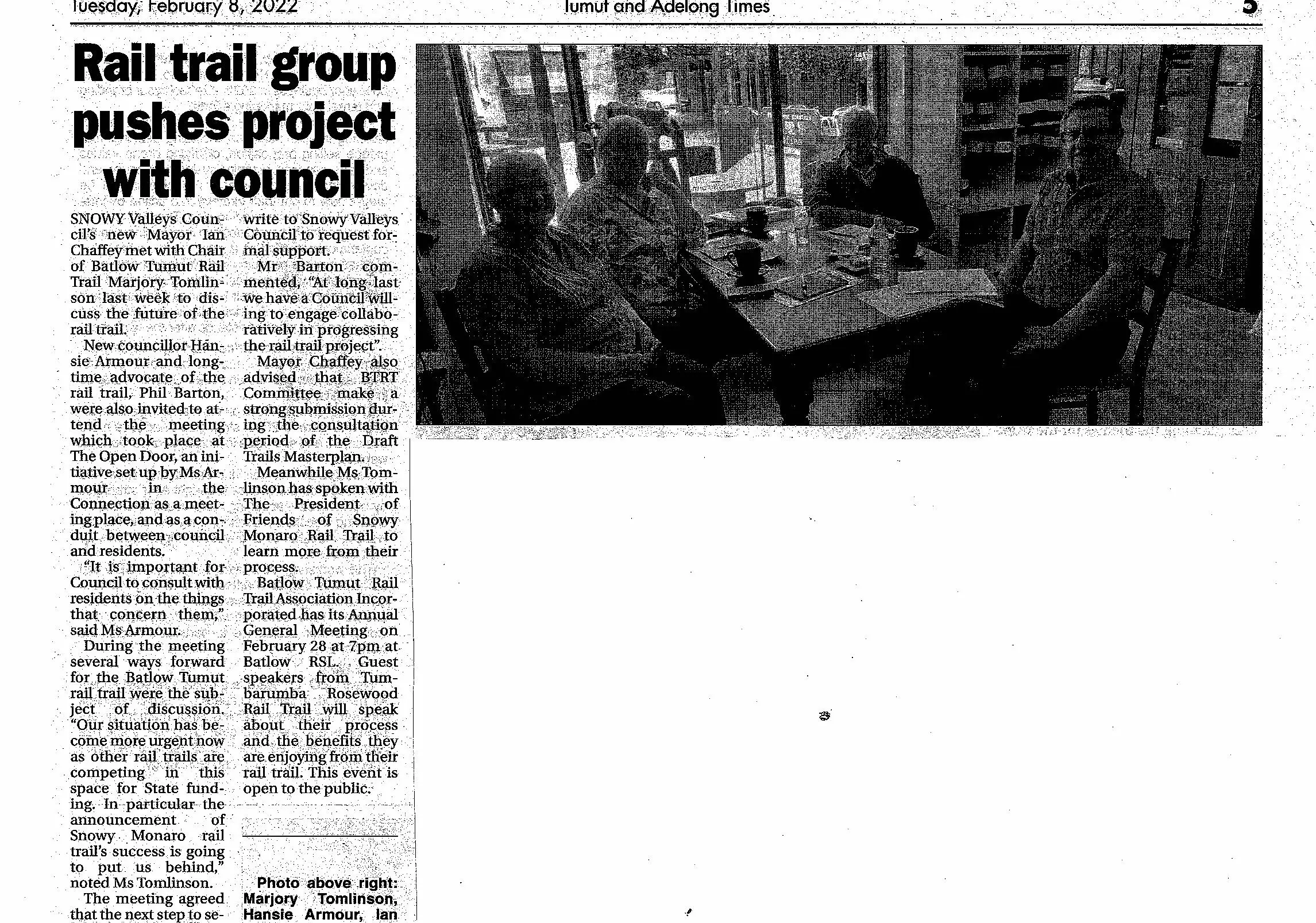The new Snowy Valleys Council is made up of Mayor Ian Chaffey, Deputy Mayor Trina Thomson, Julia Ham, John Larter, James Hayes, Hansie Armour, Sam Hughes, Brent Livermore and Michael Ivill. Most of this Council pledged to support the Batlow Tumut Rail Trail when campaigning.