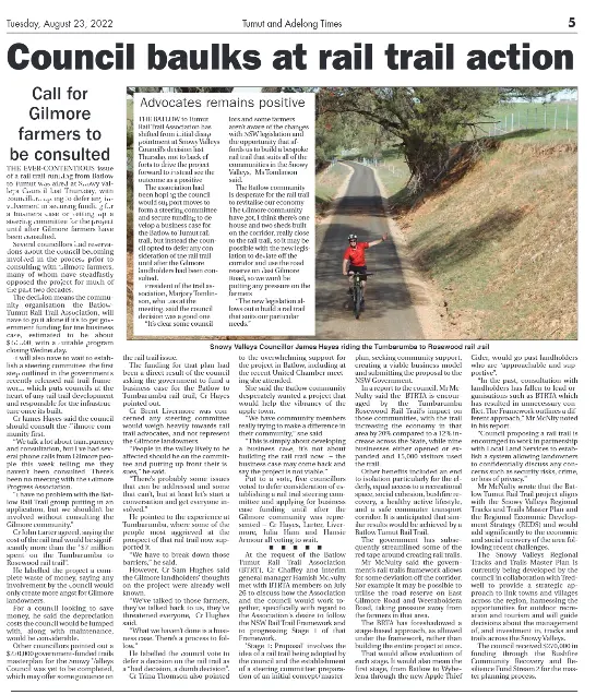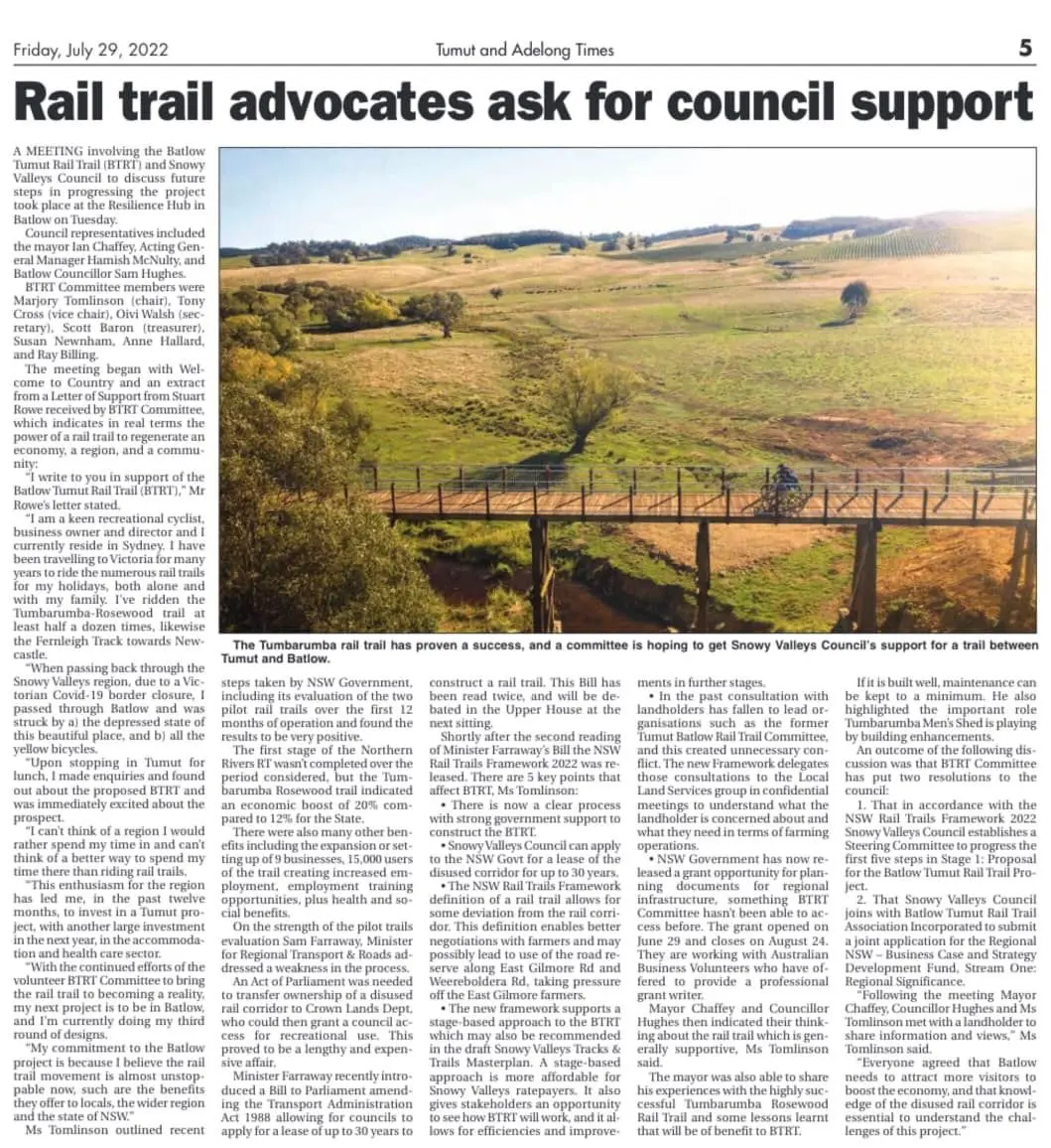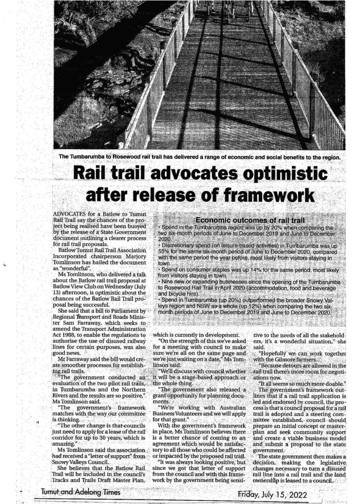 Government also released the NSW Rail Trails Framework which outlines a clear process for construction of a rail trail. In August 2022 we met with Snowy Valleys Council to discuss the Framework and put two resolutions to the next Council Meeting:
