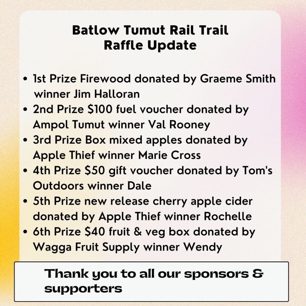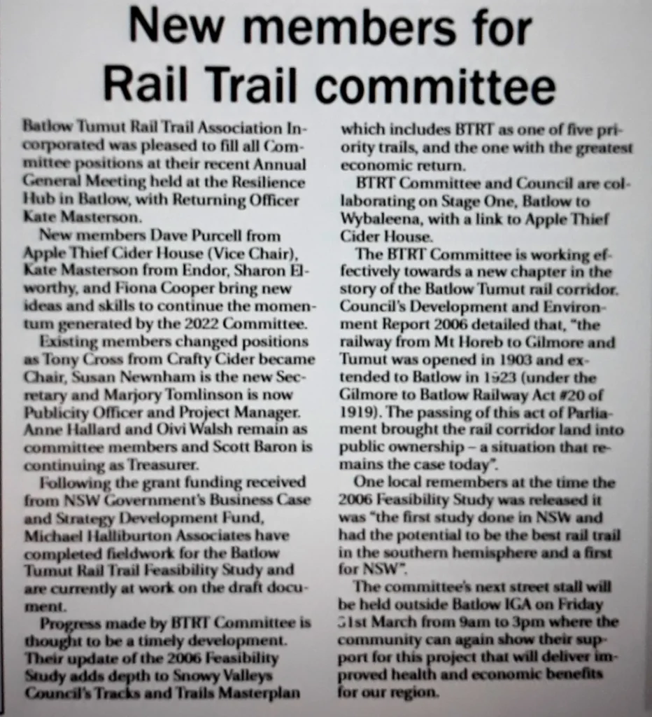 On February 28th 7pm at Batlow RSL the first AGM of the Batlow Tumut Rail Trails Association Incorporated will be held. There will be two guest speakers from Tumbarumba Rosewood Rail Trail talking about their process, and benefits from their pilot RT. This meeting is open to the general public.