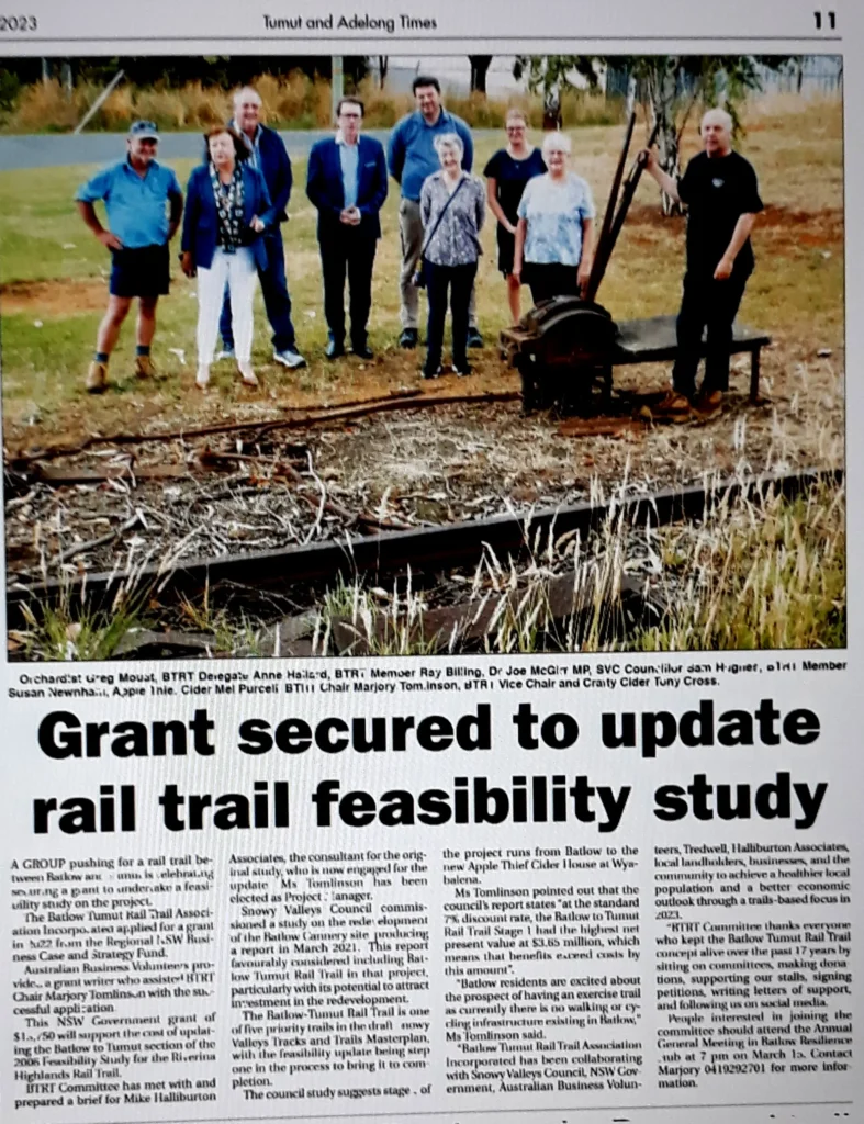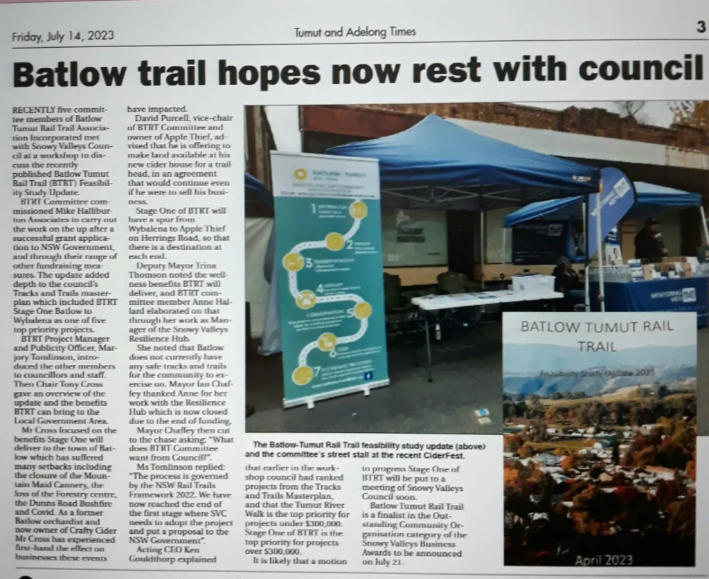 24th August 2022 we are applying for another grant for $13,500 to update the 2006 Batlow Tumut Raul Trail Feasibility Study.