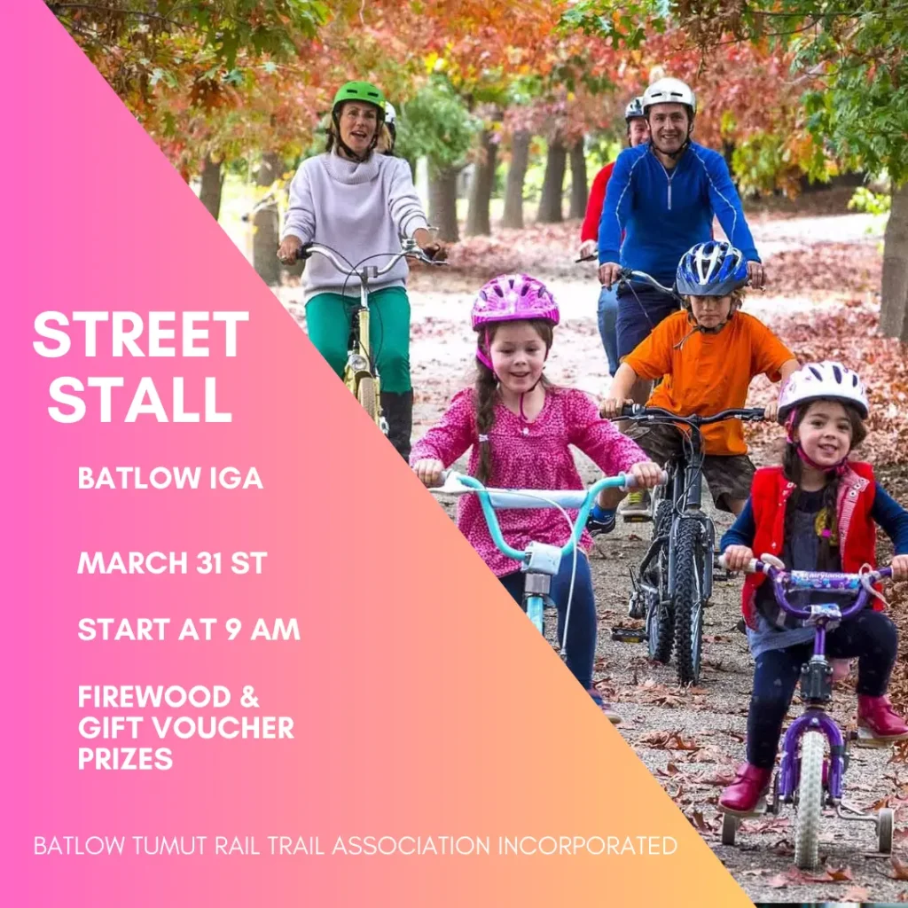 Ongoing fundraising includes a Gofundme page Fundraiser by The Batlow Tumut Rail Trail : Detailed development plan Batlow-Tumut Rail Trail (gofundme.com) , street stalls in Batlow, Adelong & Tumut, Bunnings sausage sizzle in Wagga Wagga, membership fees and donations. You can donate by transfer to this account BSB 062371 A/C 10053766 . You can also pay a $20($5 kids) annual membership fee to this account, just reference membership and your last name.